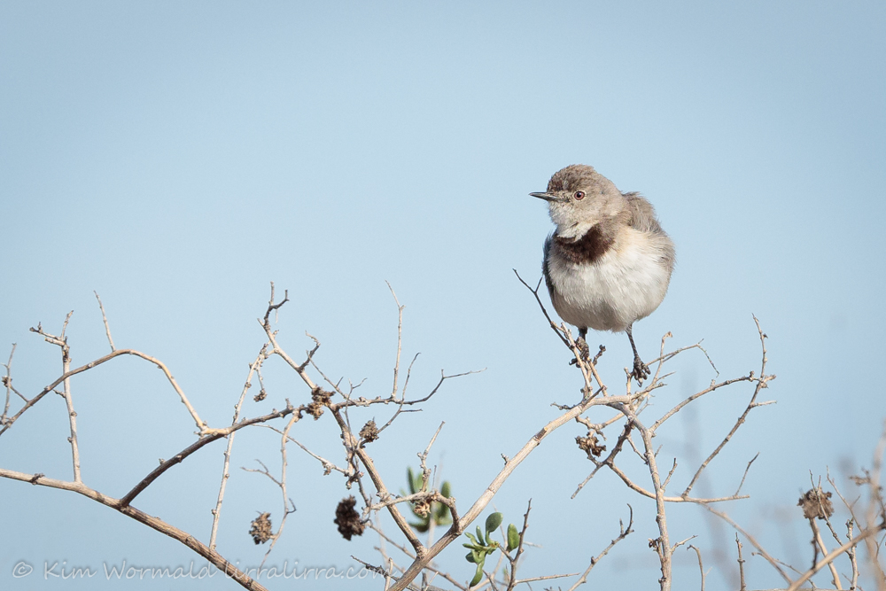 Male White-fronted Chats have less subtle markings than females. Males and females can often be seen perched at the top of shrubs, they weigh about 13g and measure about 12cm.