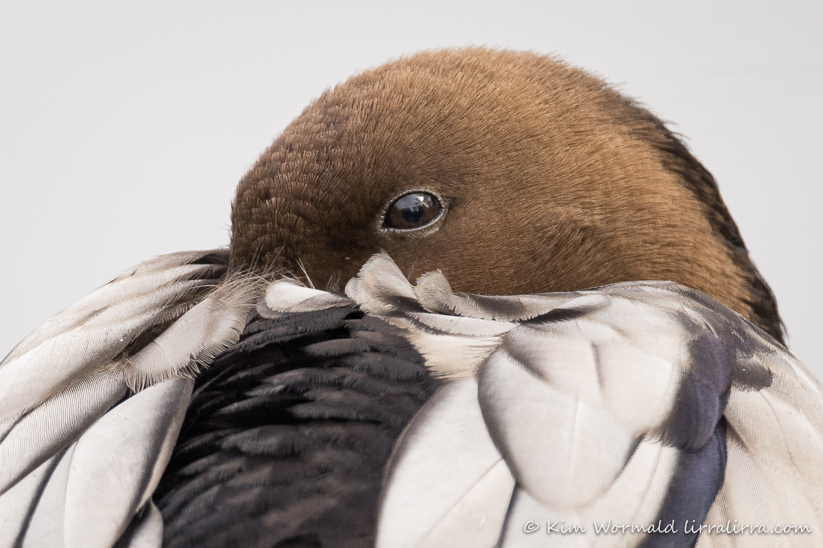 So it’s no surprise that this male Australian Wood Duck/Maned Duck was snuggled beside her for a rest. The ‘mane’ of the male is the dark row of feathers at the back of his head. He has a darker brown head than the female and lacks the white facial stripes. I really like the delicate fringing on the feathers around his face.