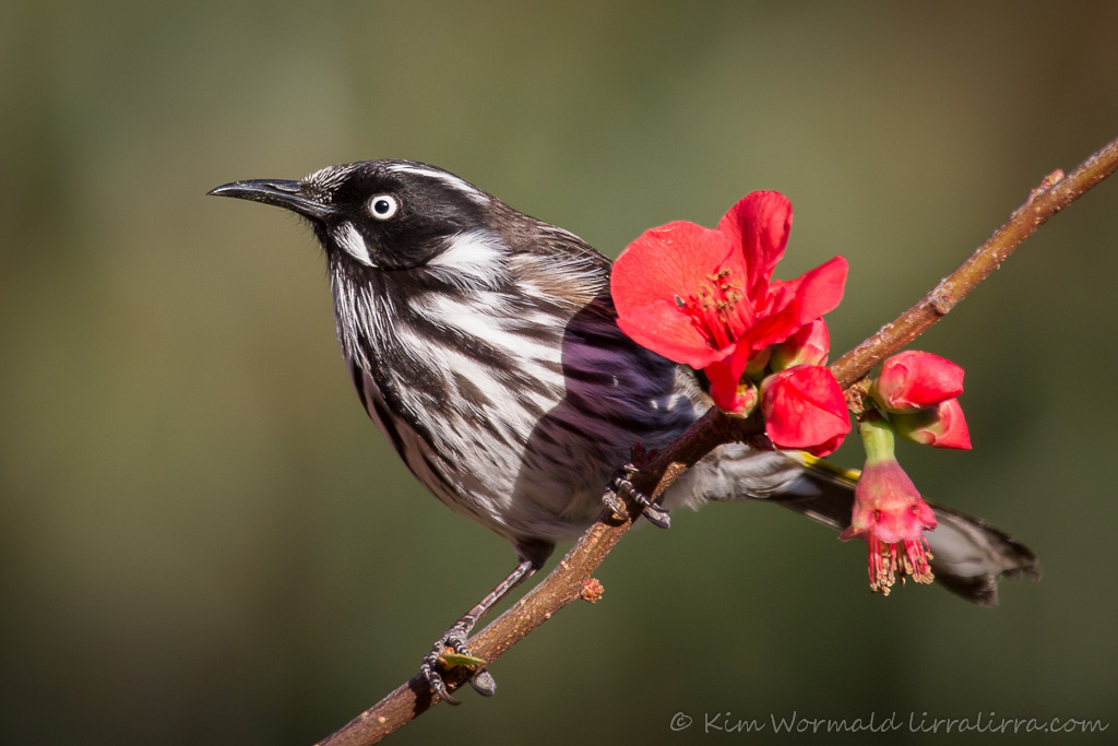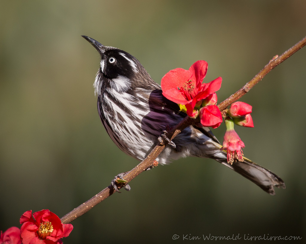 And there it was on the branch above. Honeyeaters are active feeders, darting from one blossom to another, checking them for nectar and briefly feeding from some of them. The New Holland Honeyeater’s hind toes look disproportionately large as it grasps the japonica stem and its yellow feathers can just be seen hiding amongst the blossoms.