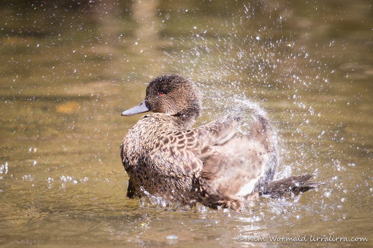 Female Chestnut Teal look similar to Grey Teal (males and females) but they are slightly darker and lack the white neck. This one was enjoying an early morning splash, which is always a lovely sight. The droplets of water make pretty patterns as the ducks ruffle their feathers.