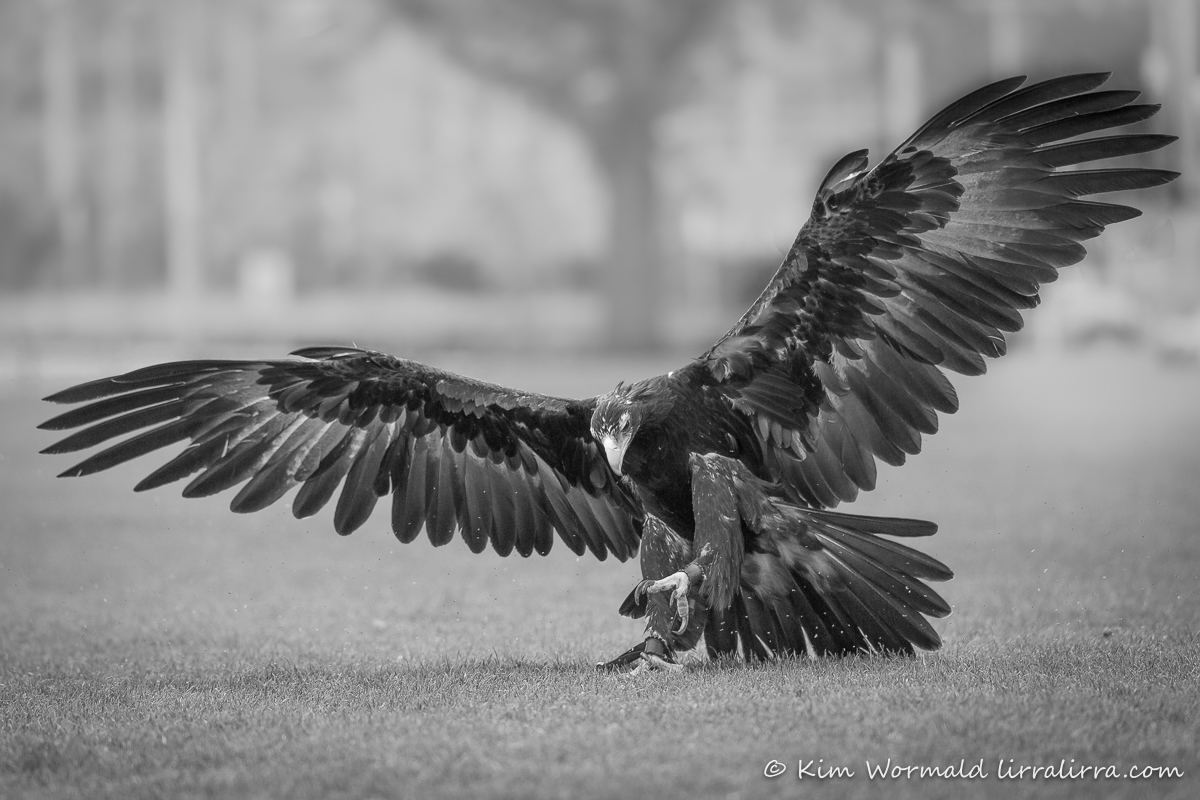 With this landing shot I love the close up details of the eagle’s tail and underwing feathers, and of its fully feathered legs, and look at those crazily strong feet and talons. I’m wondering which of these images is best, the colour or the monochrome.