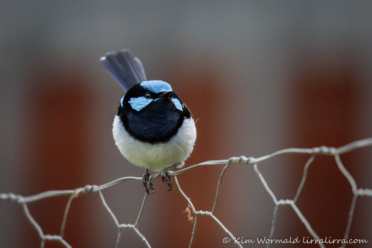 I’d hoped to meet a new species this week but that didn’t happen and the weather was so dismal that all I managed to photograph was this Superb Fairy-wren as it perched on a wire fence. Neither the perch nor the background were pretty, thankfully the bird is sweet. I like the way the wren is balancing on such a narrow perch and the way it’s holding its wing slightly away from its body.