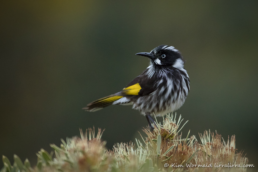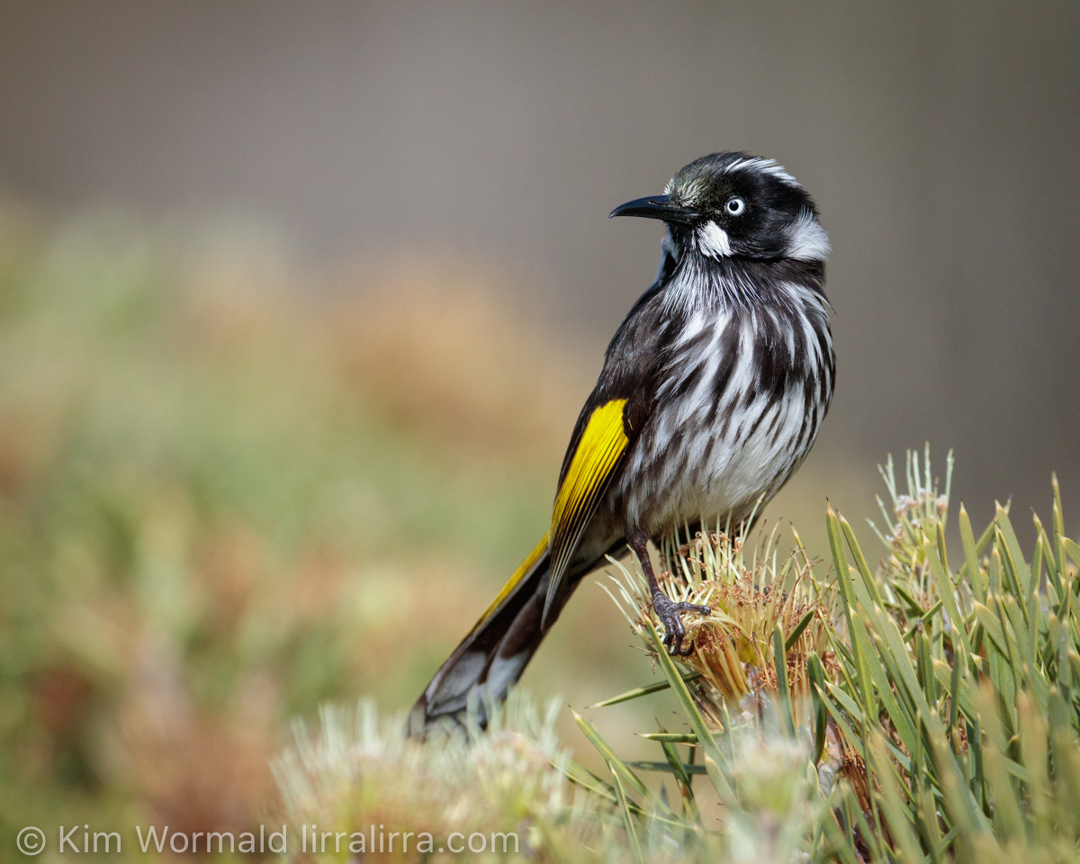This little New Holland Honeyeater looked pretty comical as it popped up to check out the neighbourhood. It’s left foot hasn’t yet rested on the hakea, the moment touch-down occurred the honeyeater was off to the next blossom.