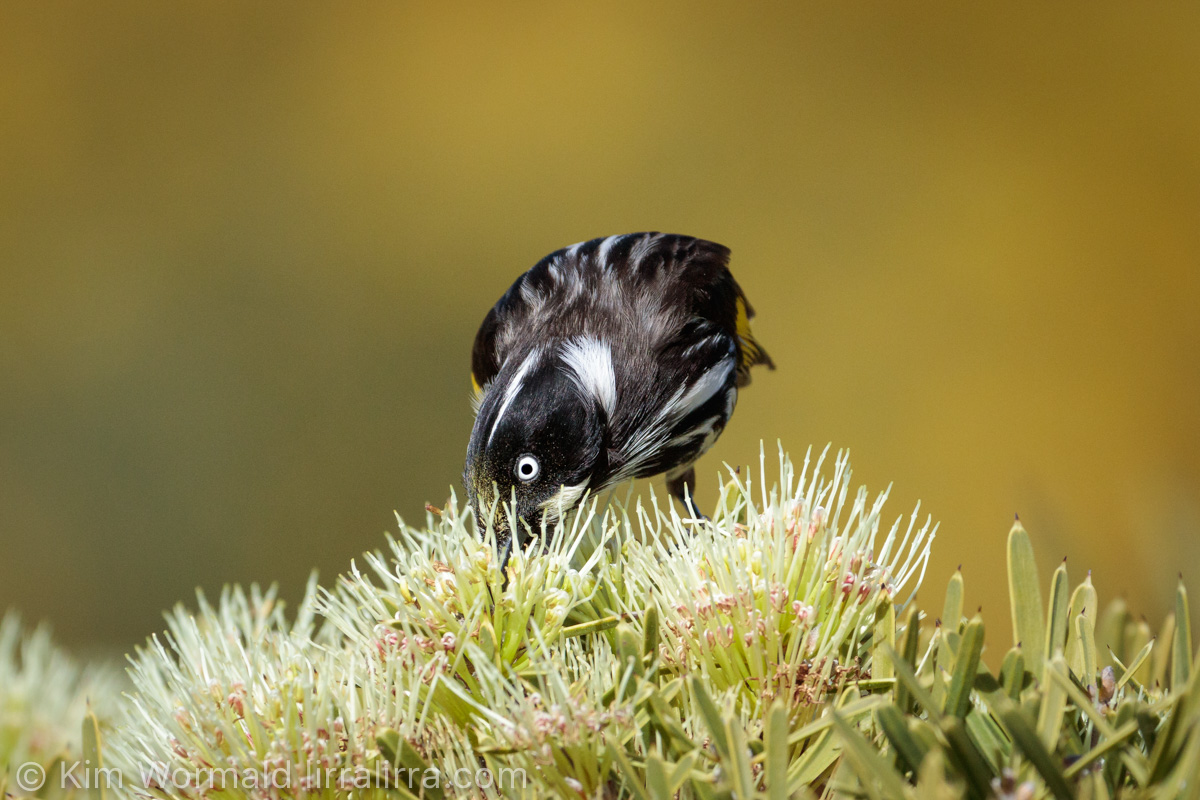 If you follow the honeyeater’s stare you will see a bee semi-hidden between the stamens of the Hakea corymbosa. I’ve often seen honeyeaters eat bees, insects and spiders and have photographs of Helmeted Honeyeaters holding spiders and a clear memory of an Eastern Spinebill carrying a bee towards its nestlings.