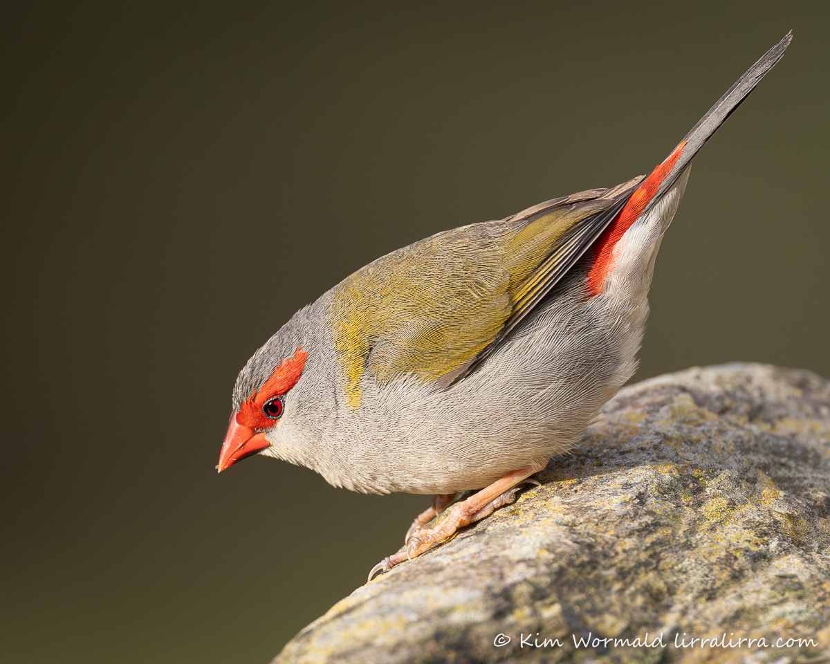 What a lovely week! A flock of about thirty Red-browed Finches have been enjoying the grass seeds at my place. I was watching them this afternoon when this little female hopped onto a rock. I should say, probably female, as the brow of the male usually has a blunter end.