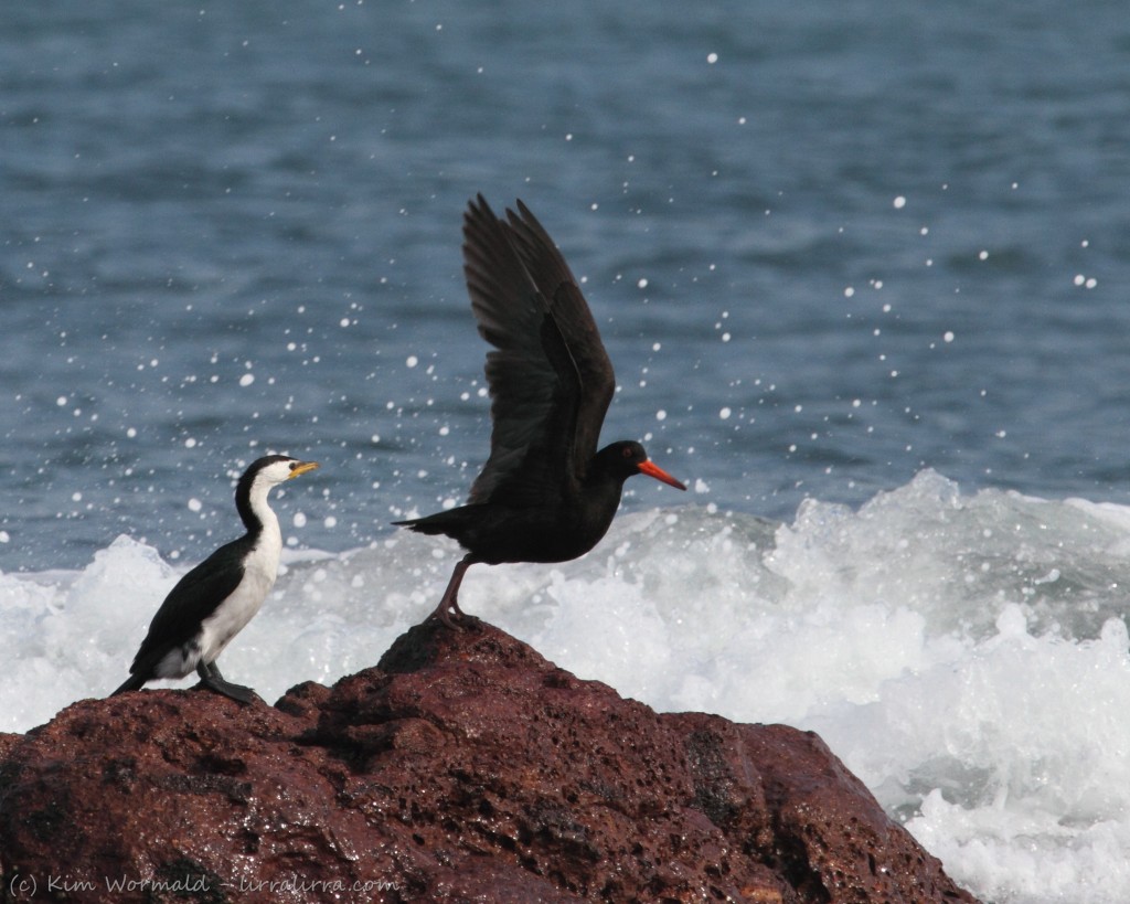 Sooty Oystercatcher cleared for take-off, Little Pied Cormorant on the runway.