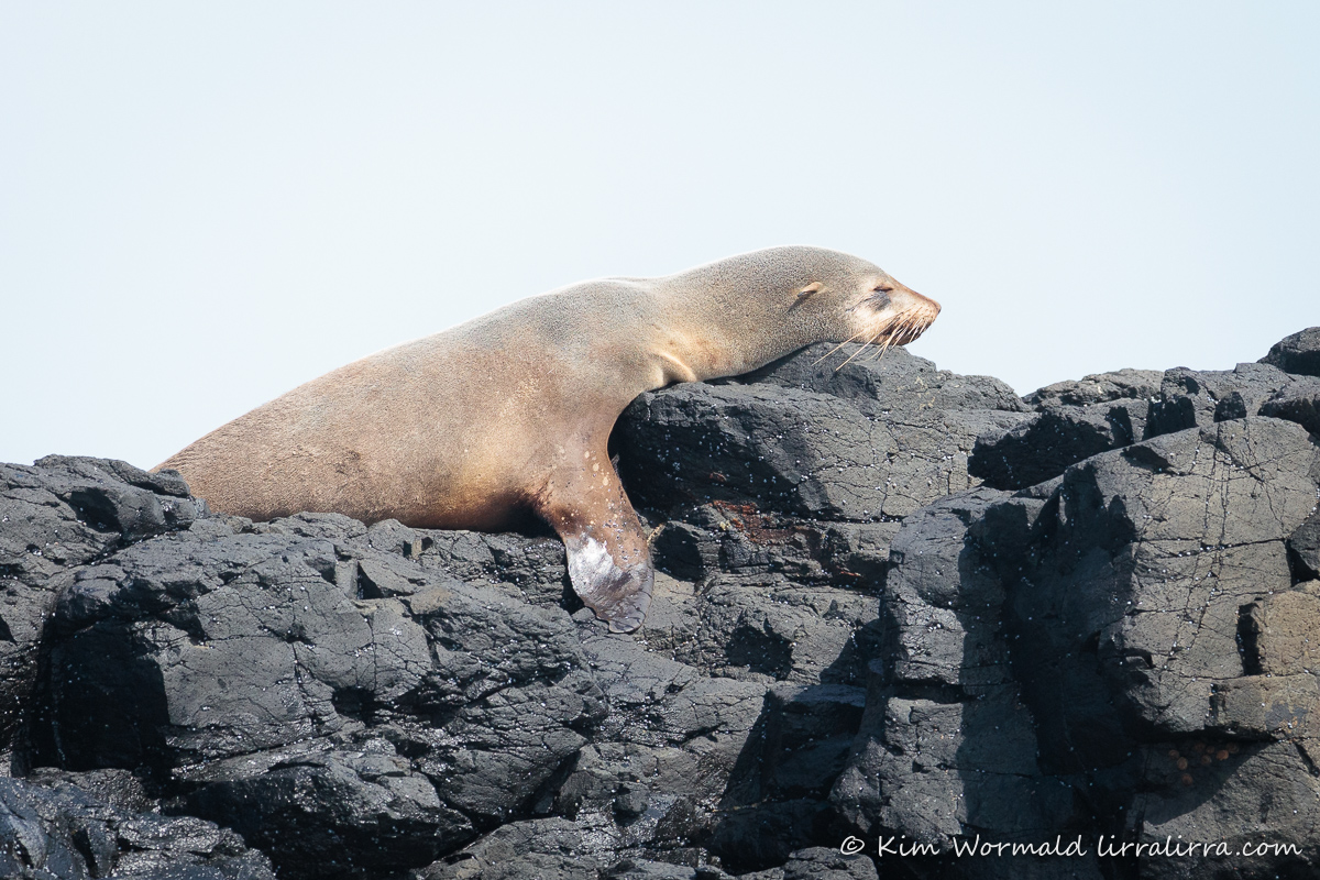 On the trip I saw Silver Gulls, Australasian Gannet, three swimming Little Penguins, some Short-tailed Shearwaters, a White-breasted Sea Eagle and a few distant rows of terns. The main attraction was the Australian Fur Seals. Most of the seals were pretty active, adding to the difficultly of taking photographs from a lurching boat in lighting conditions that kept changing. A few of the seals were snoozing, somehow finding their rocky beds comfortable enough to sleep on. The seal above caught my attention, could it really be as comfy as it looks!