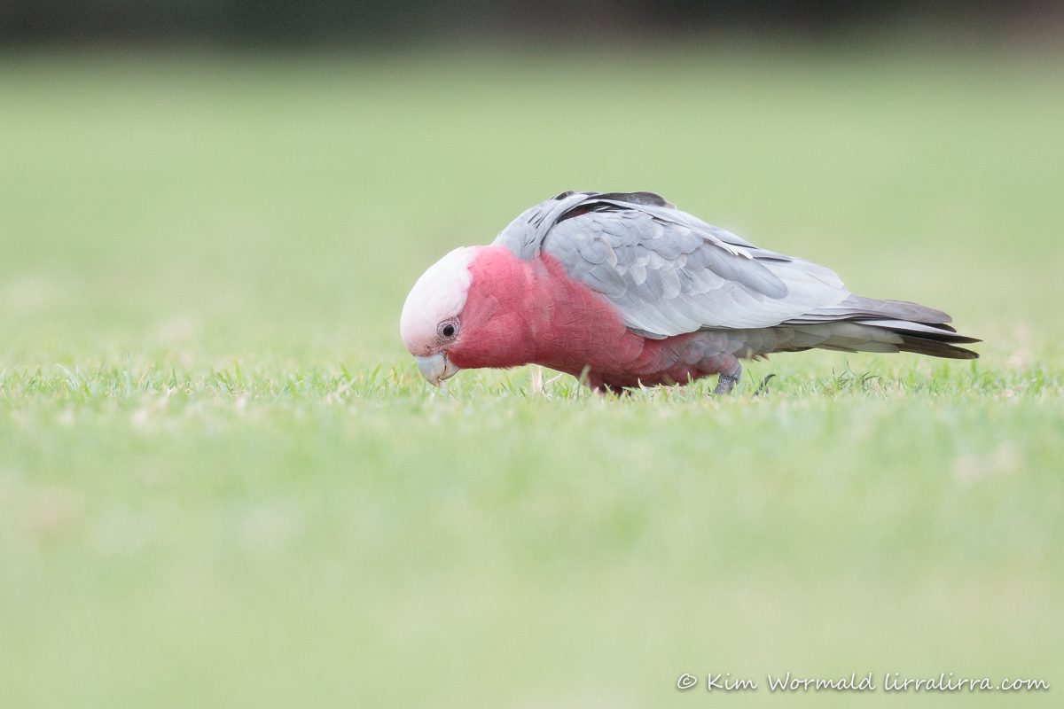 These images from the oval clearly show the narrow plane of focus along the blades of grass. Grass in the foreground and background is well blurred which means that the Galah stands out.