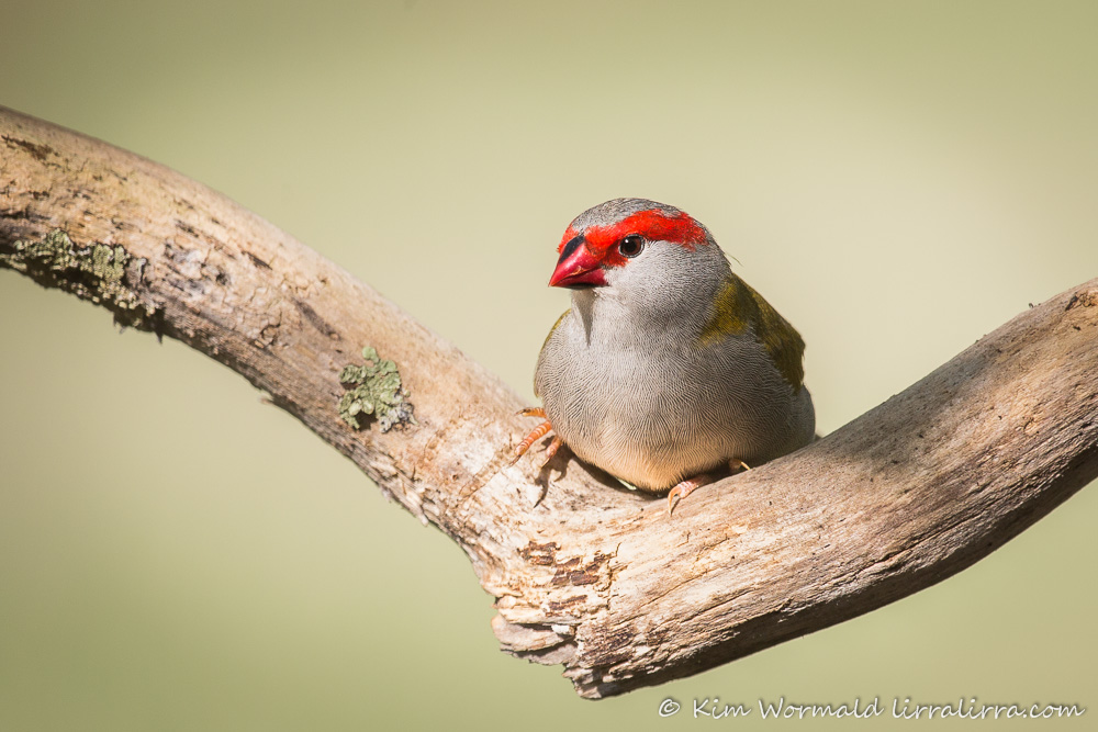 The image above is a juvenile Red-browed Finch that is just developing its scarlet eyebrow and the scarlet sides to its bill. As it grows its eye will also change to the reddish-brown eye of an adult. I like the way the narrow depth of field shows that the finch’s tummy feathers are soft, in the literal and photographic sense of the word.