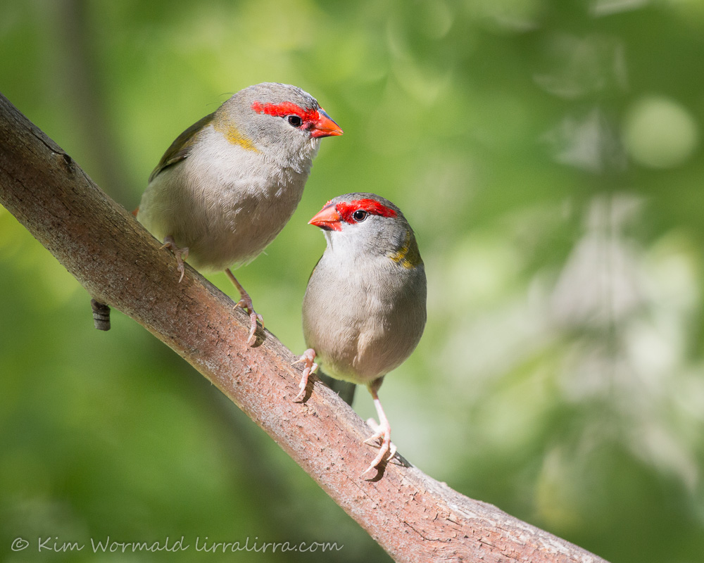 The image above is a female Red-browed Finch. The eyebrow of the females tapers to a fine, ladylike point rather than the blockier eyebrow of the males.