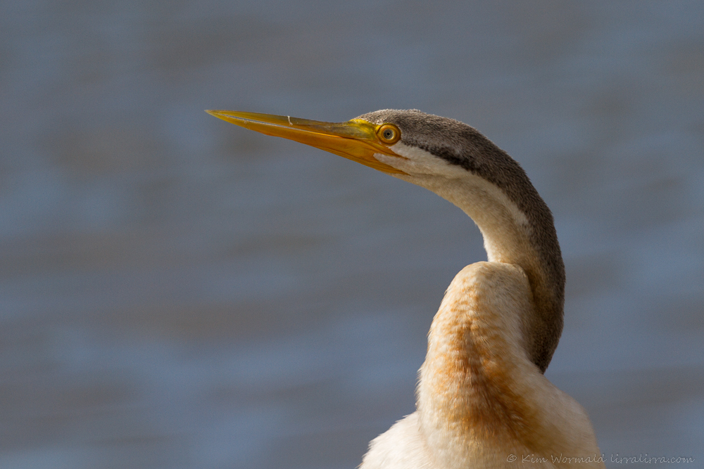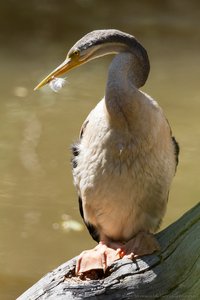 I find this image wistful, as though the bird is looking to the heavens for help to remove the foreign object from its bill; though it’s more likely checking out a flock of Little Corellas. Just above the feather, to the right, is a little curve of reflected light that I believe could be part of a fishing hook. I called the shire hoping to speak to a ranger but was asked to contact Wildlife Victoria (which I have done), while the shire contacted the on-site parks coordinator about the possibility of a clean-up. I’m concerned the darter could become trapped while diving.