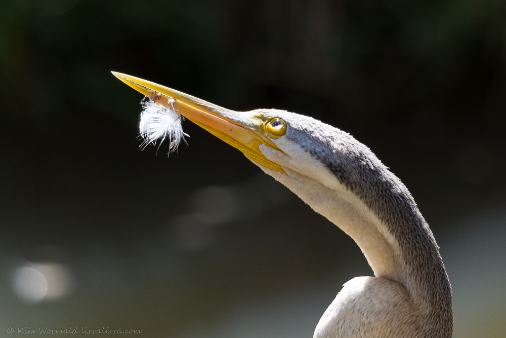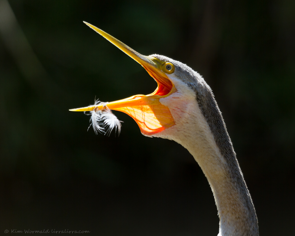 Sometimes serendipity means I can catch a moment like the one in the image above; this darter began calling while I was looking at it through the camera. The sunlight looked amazing shining through its skin and highlighting the spear-like quality of the bill against the dark background. Its call was a guttural “kar kar kakakakaka” that caused its throat to vibrate. It was a beautiful moment. At this point I wasn’t concerned about the feather on her bill, I thought it was from normal preening.