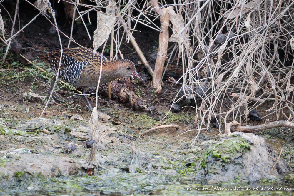 I stared at the dark spaces beneath the lignum vegetation for ages before there was any movement – talk about exciting! Lewin’s Rail are smaller than the more commonly seen Buff-banded Rail but move just as rapidly. I took photographs in little bursts as the rail dashed along the edge of the water. Continuity of the shots can be seen in the first three photographs if you look closely.