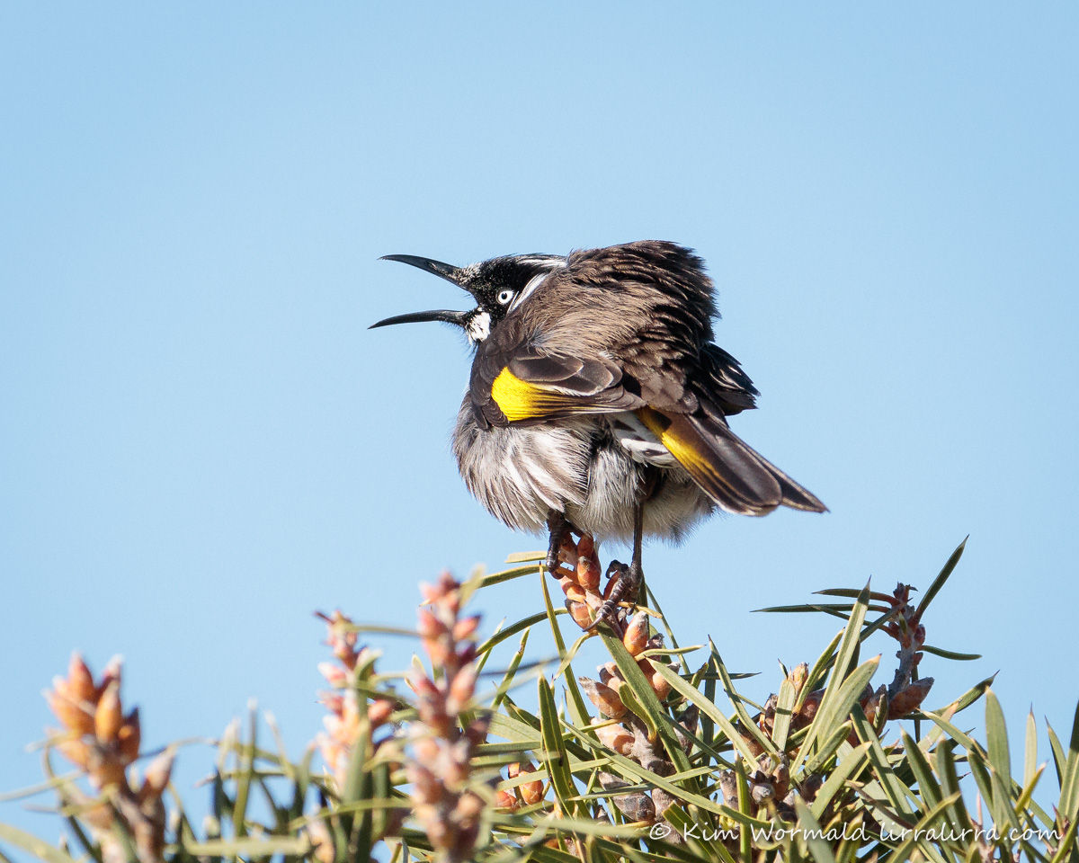 New Hollands can be found across southern Australia from just north of Perth to around Brisbane, including Tasmania. They are about 18cm in length and weigh about 20g and can be tricky to photograph as they move so fast and camera settings have to be set carefully to ensure that the blacks and whites are properly exposed. They are mainly black and white with a yellow wing patch and yellow tail sides. Their underparts are streaked black and white, they have white eyebrows, white cheeks patches and white malar patches that extend from the base of the bill.