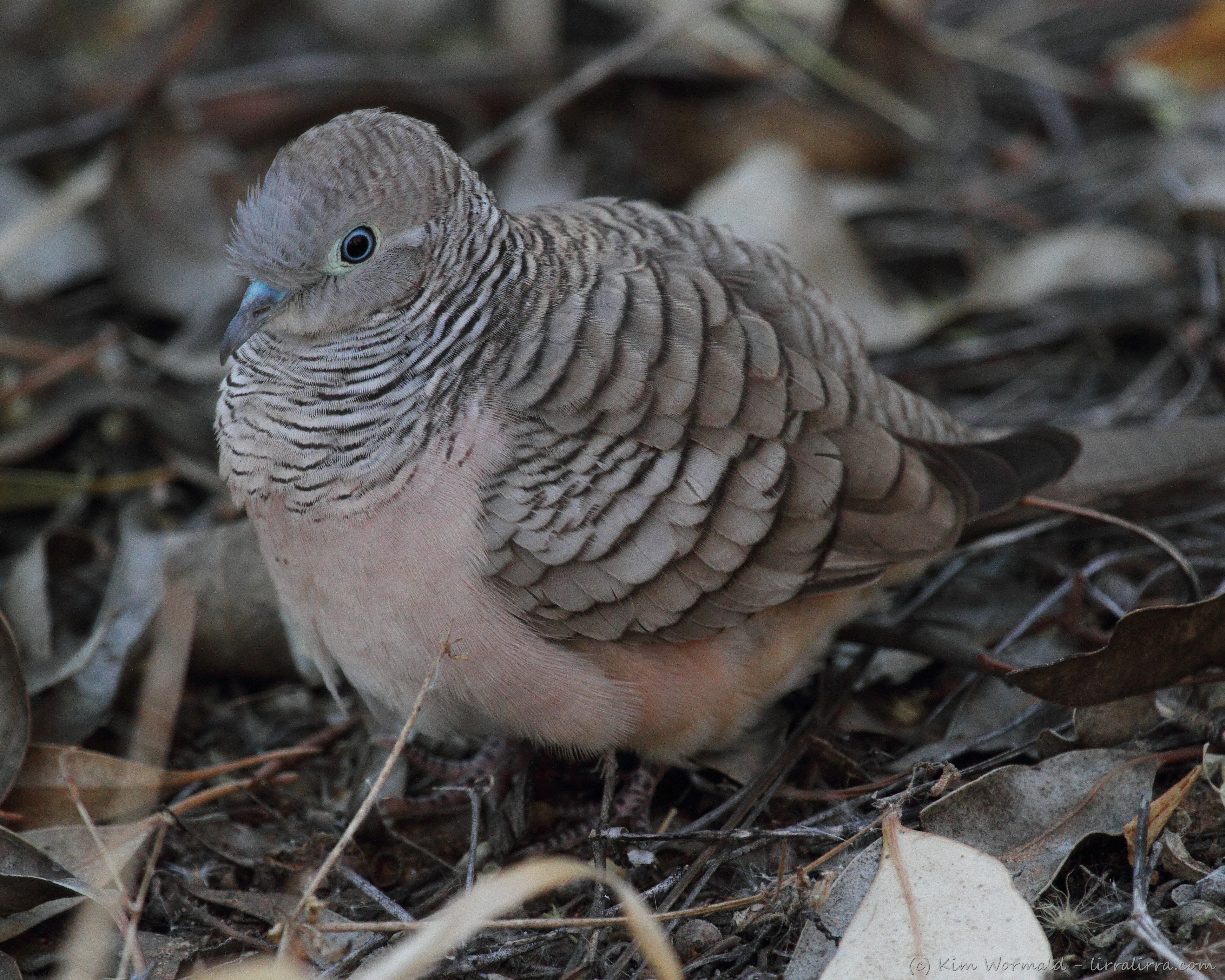 Rachel and I were walking along the track at the Ellery Creek Big Hole when she pointed at the ground and insisted she’d seen a bird. I circled the patch of ground until I spotted this exquisite Peaceful Dove who was sitting very still and blending remarkably well with the leaf litter. At 22cm and 54g it is a cuddly little specimen with sweet pastel colouring. The cere, lores, eye and eye-ring are blue while the underparts and feet are pink. I particularly like the scalloped and barred feathering on wings and throat.
