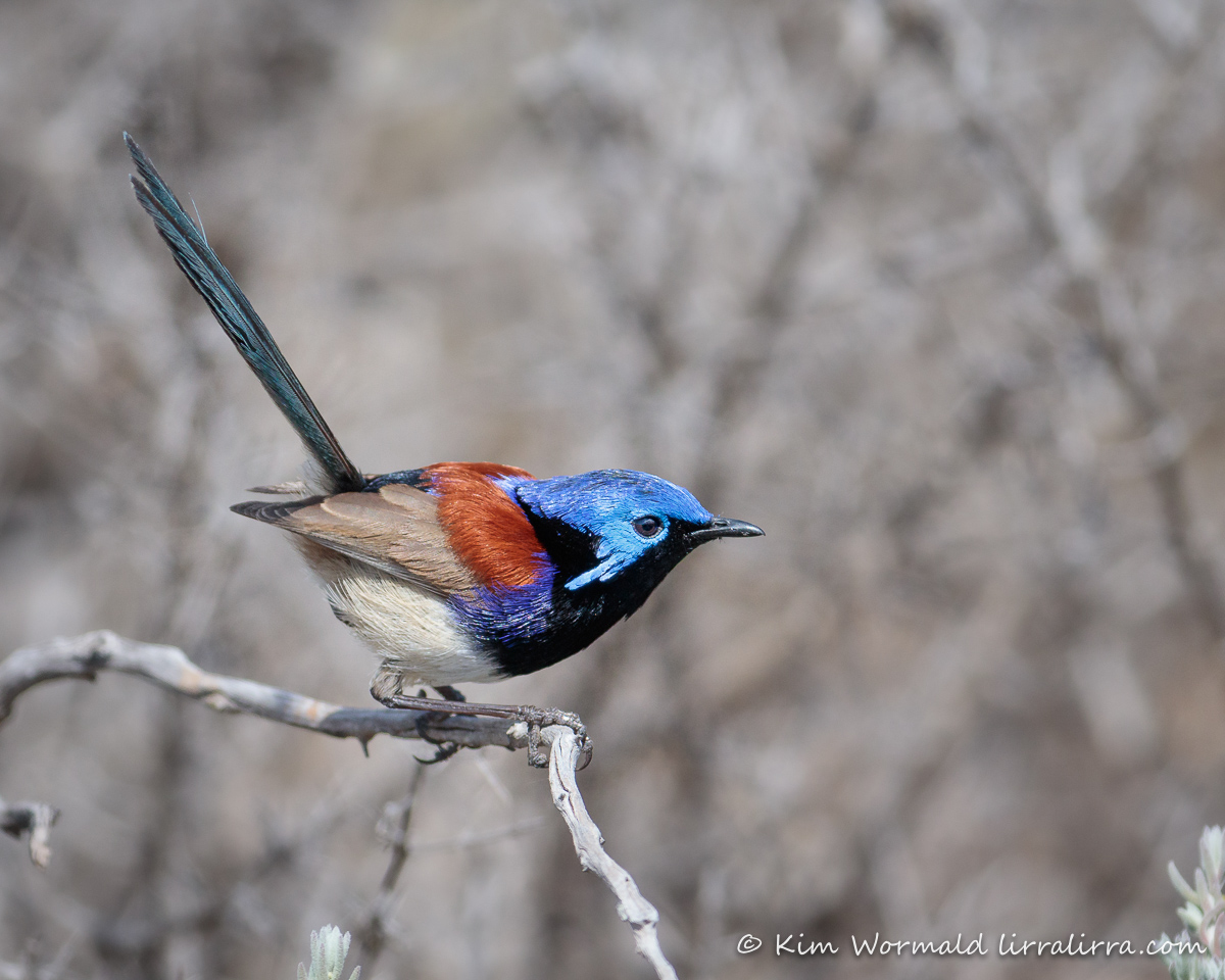 Male Purple-backed Fairywrens are magnificent with their long, grey-blue tails and exquisite breeding colours. Their crowns are bright blue with lighter blue cheeks and eye rings, their shoulders are chestnut edged with lilac patches and almost completely covering their purple backs in this image, they have soft brown wings, black breasts and creamy white underbellies – what’s not to love?