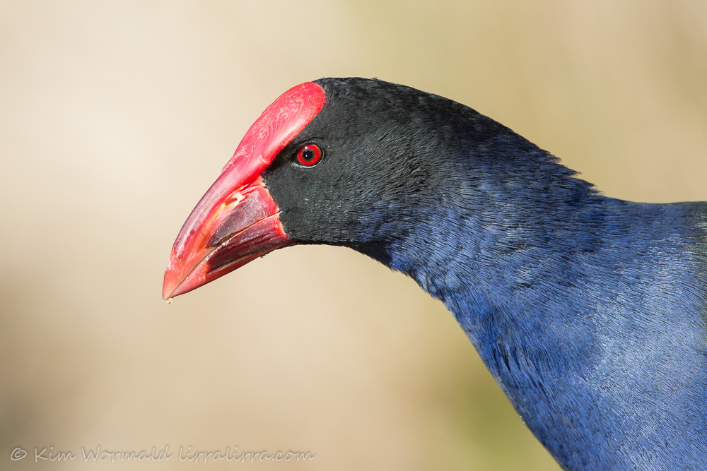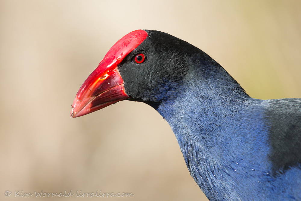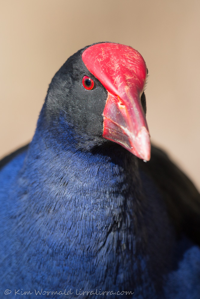 I like the eye-contact of the top image but the droplets and chest definition of the portrait above, it would have been nice if they’d been in the same image! Purple Swamphens are large rails, measuring about 46cm. Their bills and frontal shields are bright red and strong. Not many birds have frontal shields and their purpose is not well understood but believed to play a part when choosing a mate and to offer protection when feeding.