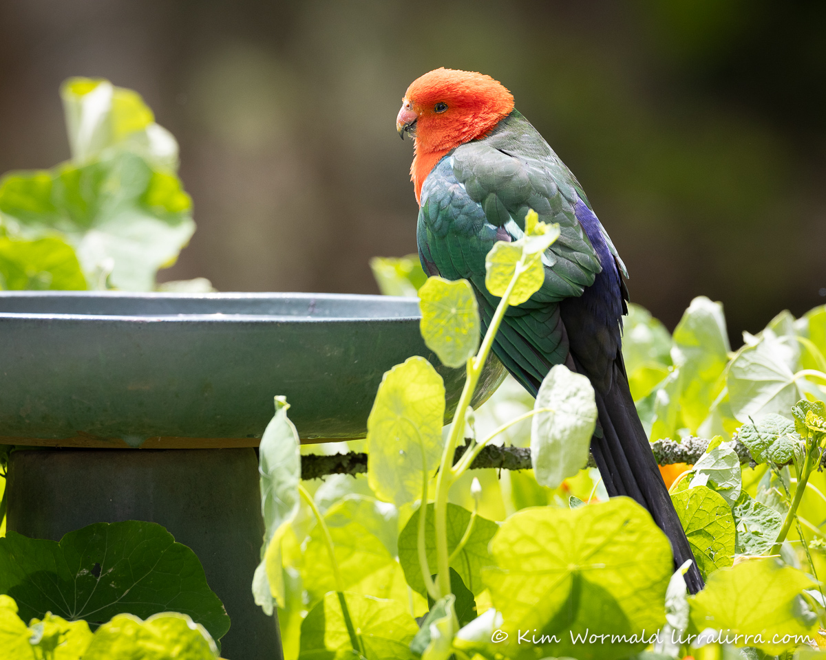 It was breakfast time when I saw a male Australian King-Parrot at the birdbaths. It’s always a thrill to see these magnificent parrots, especially as they don’t often visit my place. I abandoned my cornflakes to take some quick shots through the window, and then I started to feel concerned…