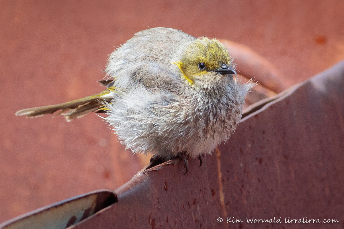 And here is a Yellow-plumed Honeyeater that definitely looks round. It is nicely fluffed up after bathing and drinking at a water barrel. These barrels are filled for bees and a grid floats on the water which means that the birds and bees have somewhere to perch as the water level drops.