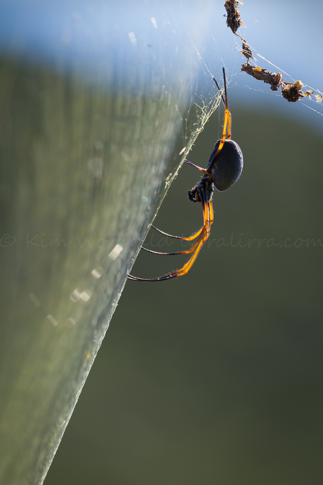 The “golden” in Golden Orb-weaving Spider relates to the golden sheen of their webs, which can be seen in the image above. Also visible are the contents of the spider’s pantry, or possibly the remnants of previous meals. The spider in the image is female, the males are very tiny in comparison.