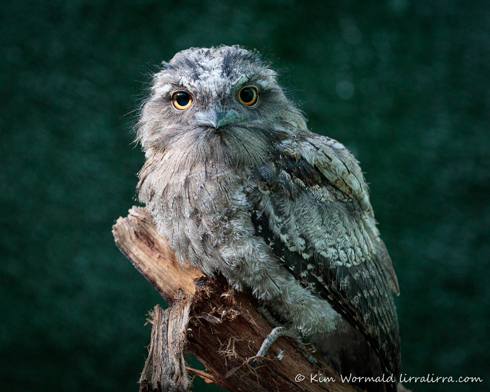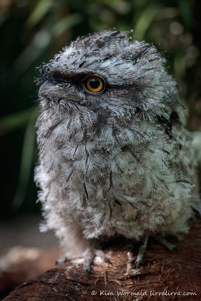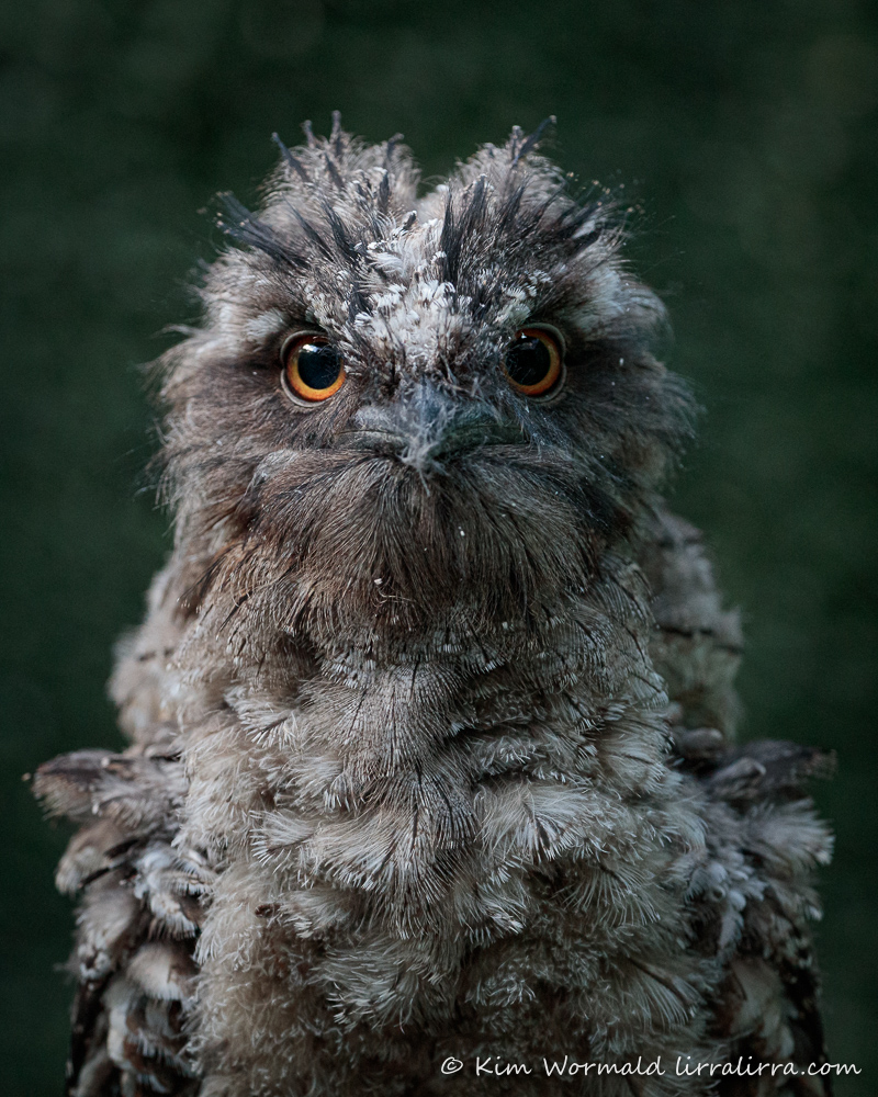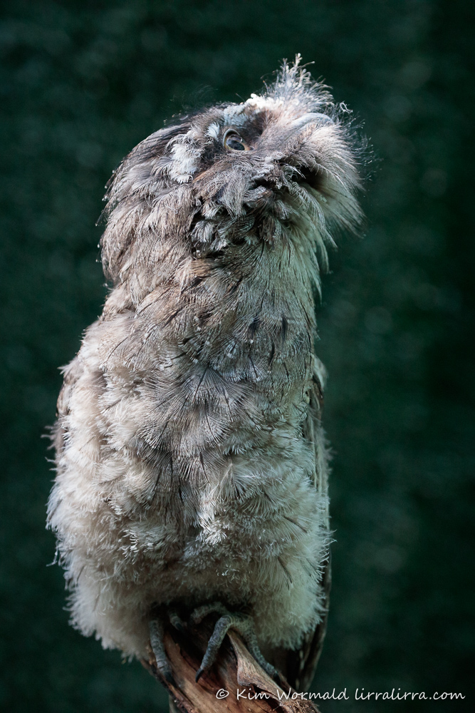 I hadn’t been in the aviary for long when the tawny above nestled beside me on the ground, it was so sweet. When I shuffled back to get more distance between me and the main clusters of tawnies, this little one moved with me, snuggling close and pecking at my cardigan. Then it hopped onto my lens and stayed there for ages, burbling with soft, churring/purring sounds – it was magical. Eventually it was getting late and I needed to head for home. I felt quite sad as I gently lifted it to a perch. It seemed to treat me as if it thought I was a parent tawny, or maybe my hair reminded it of the scraggly nests made by Tawny Frogmouths.