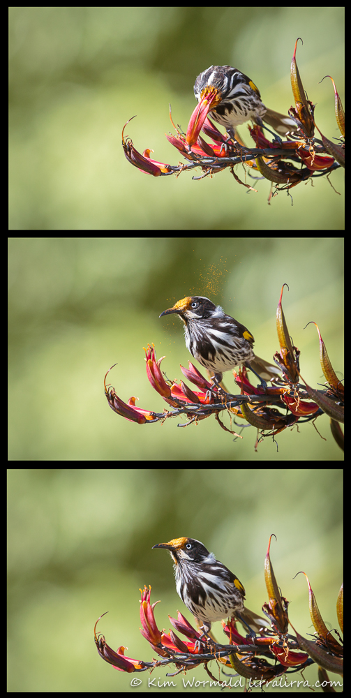 In the first image the New Holland Honeyeater had its bill deep inside the flax lily so it could lap up the nectar with its brush-tipped tongue. The lily’s stamens are heavy with golden pollen which is dusting the honeyeater’s head. The bird’s right eye can just be seen but it is vulnerable when feeding, especially from flowers like this that significantly affect its ability to keep watch.