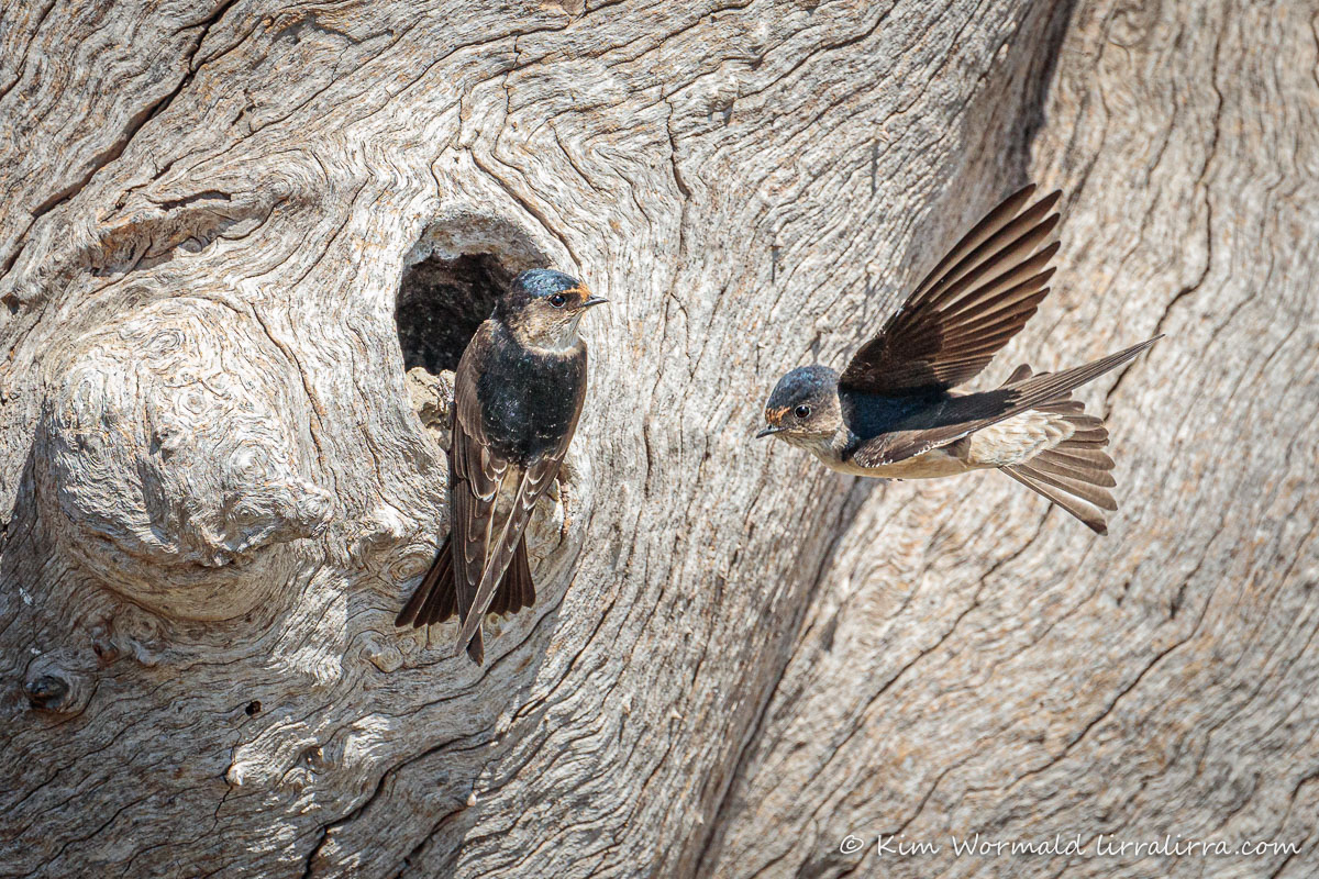 Tree Martins are named because of their preference to nest in tree hollows. Sometimes the entrances are too big for comfort so the birds modify the opening using mud. They often live around lakes and wetlands so can easily collect mud from the water’s edge.