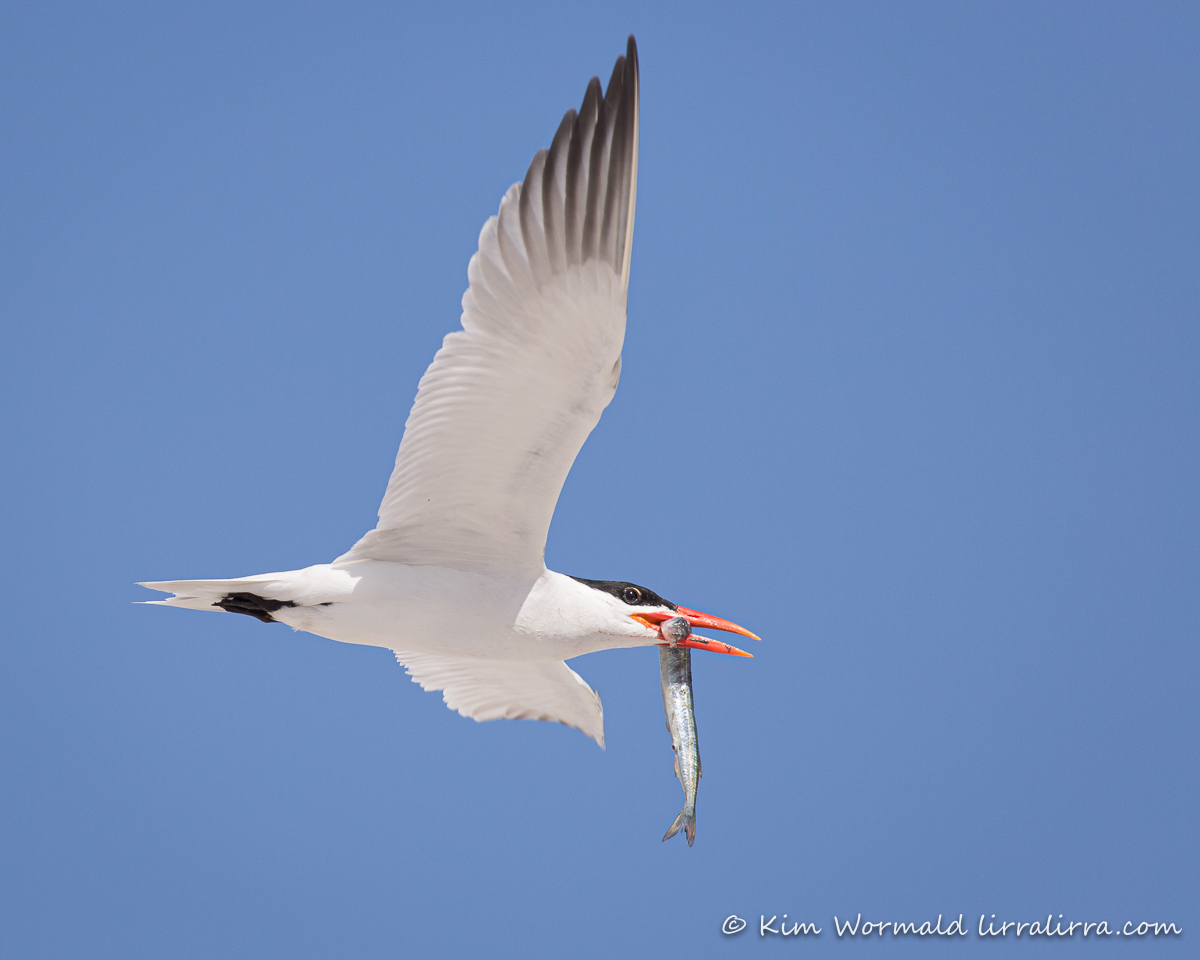 Caspian Terns are the largest terns. They fly about 15 metres above the water before plunging to catch fish, which they usually swallow, head-first, in flight. They often have a dusky tip to their bill and their black caps become streaky during winter.
