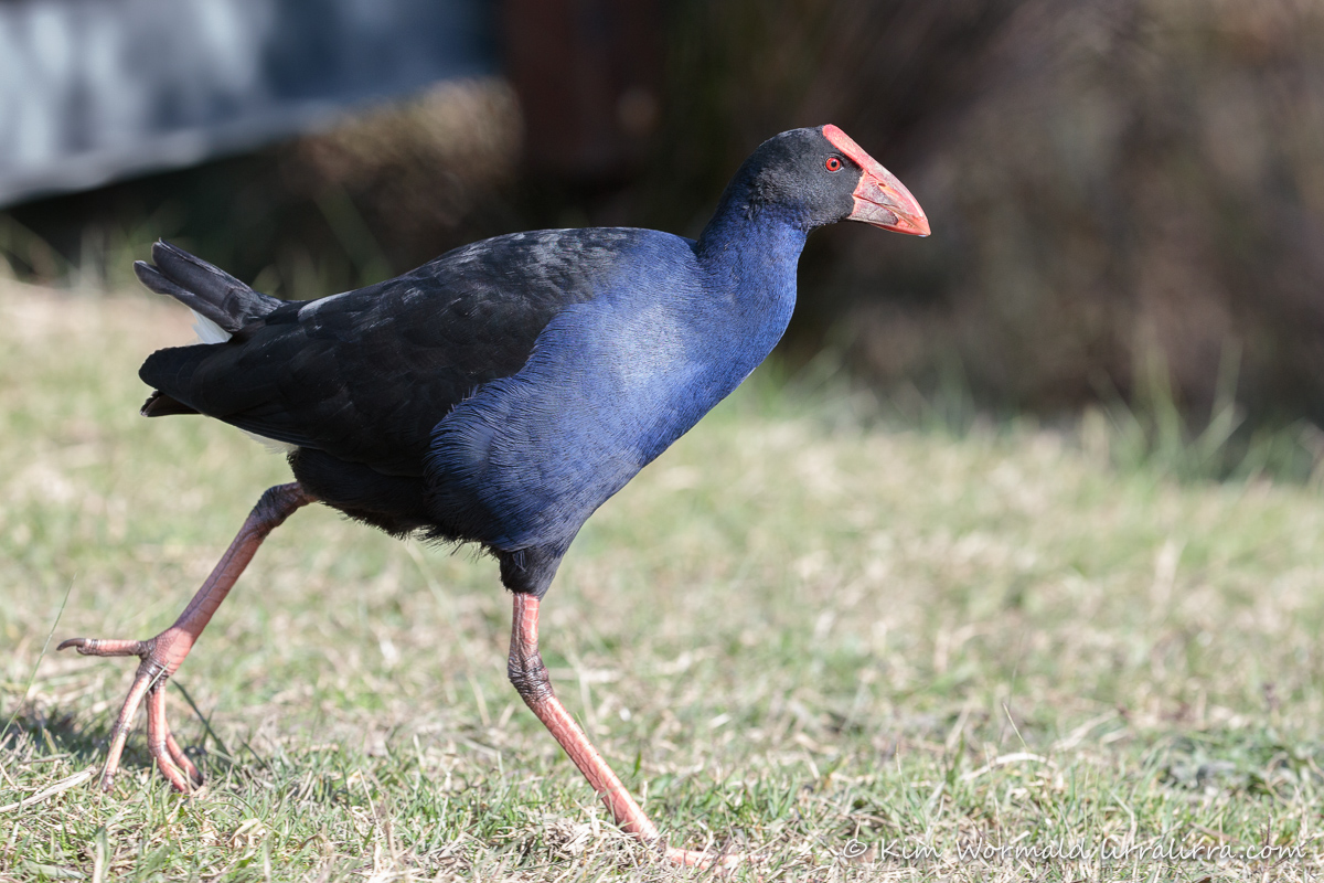 This Australasian Swamphen, previously known as Purple Swamphen, jumped down from the bridge railing in last week’s image and strode across the grassy banks of the pond towards the rest of its clan.